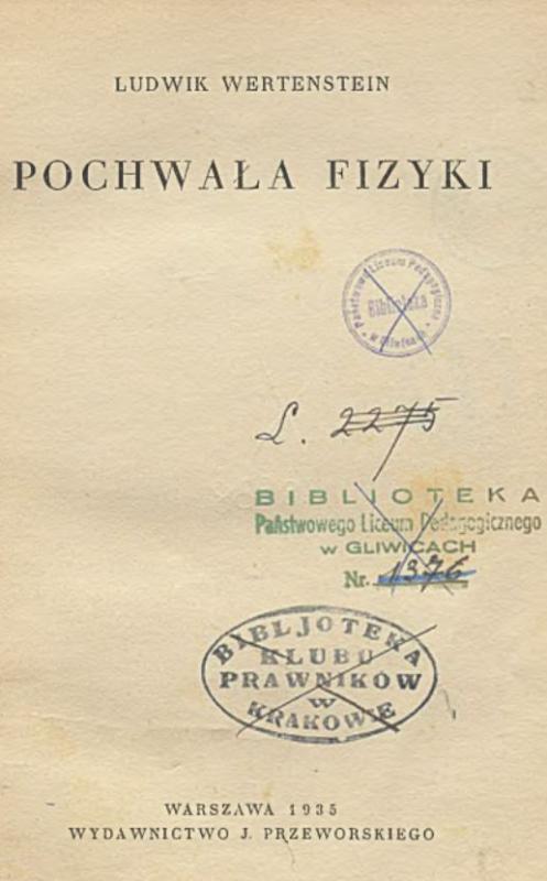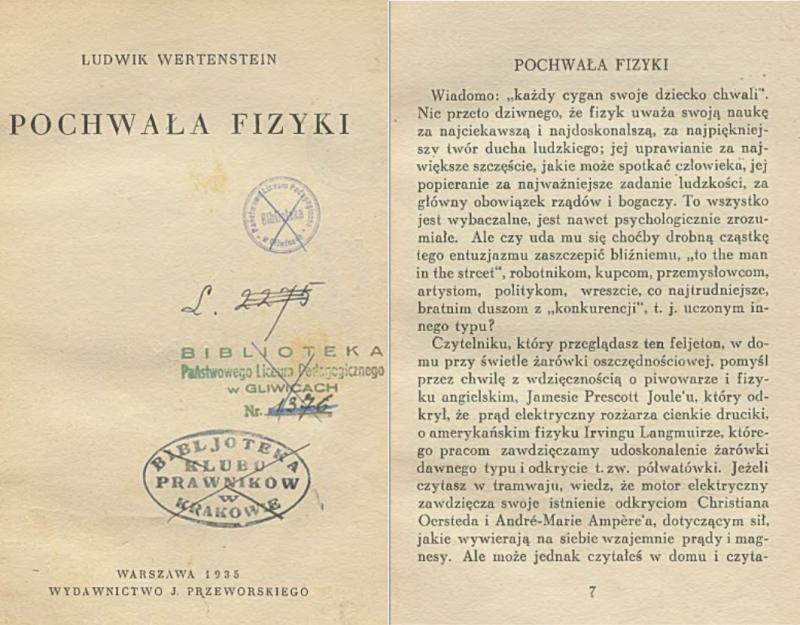 Wertenstein był jednym z najaktywniejszych popularyzatorów nauki w międzywojennej Polsce. Za jedną ze swoich misji uważał potrzebę tłumaczenia skomplikowanych i trudnych zagadnień naukowych zwykłym ludziom, do czego zresztą miał osobny talent. […] „Olśniewał wszystkich błyskotliwością spostrzeżeń i referatów naukowych, jak również okolicznościowymi wierszykami i epigramatami, w których nie wiadomo co było bardziej podziwiać: lotność humoru czy wysoki poziom literacki”[29] – wspominał Józef Rotblat. Nic dziwnego, że przez ponad 20 lat napisał setki felietonów i artykułów popularyzatorskich w prasie codziennej i czasopismach ilustrowanych[30] oraz wygłosił kilkadziesiąt odczytów. W 1935 roku wybór jego tekstów popularyzatorskich ukazał się w formie książkowej pod tytułem Pochwała fizyki, gdzie w celu osiągnięcia lepszej zrozumiałości trudnych zagadnień naukowych posłużył się cytatami m.in. z Szekspira, Mickiewicza, Wyspiańskiego, a także przykładami zastosowania procesów i wynalazków naukowych w domu i życiu codziennym.