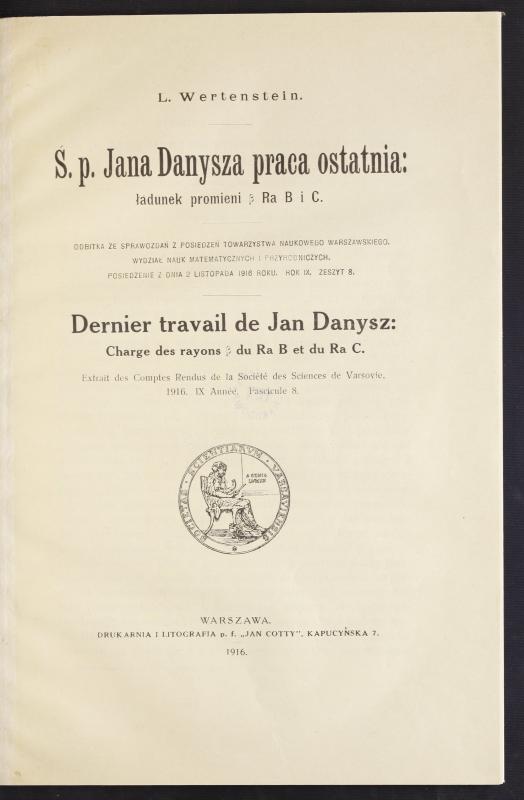 Pracownia Radiologiczna Towarzystwa Naukowego Warszawskiego im. Mirosława Kernbauma została oficjalnie otwarta 13 listopada 1913 roku, kiedy to do Warszawy przyjechała sama Maria Skłodowska-Curie. Choć formalnie ona była szefową, to początkowo faktycznie kierował nią Danysz. Niestety po wybuchu I wojny światowej Jan Danysz powrócił do Francji, by objąć dowództwo swojej sekcji w 28 Pułku Piechoty i w listopadzie 2014 roku zginął na polu bitwy. Prowadzenie pracowni przejął wówczas Wertenstein, który pełnił tę funkcję aż do początku II wojny światowej. Od 1926 roku Maria Skłodowska-Curie była honorowym kierownikiem placówki.