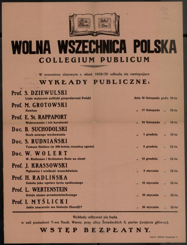 [16] Wolna Wszechnica Polska – prywatna uczelnia powstała w 1916 roku z działającego od 1905 roku Towarzystwa Kursów Naukowych. Działalność zakończono w 1952 roku, a z jej oddziału zamiejscowego w Łodzi powstał Uniwersytet Łódzki.
